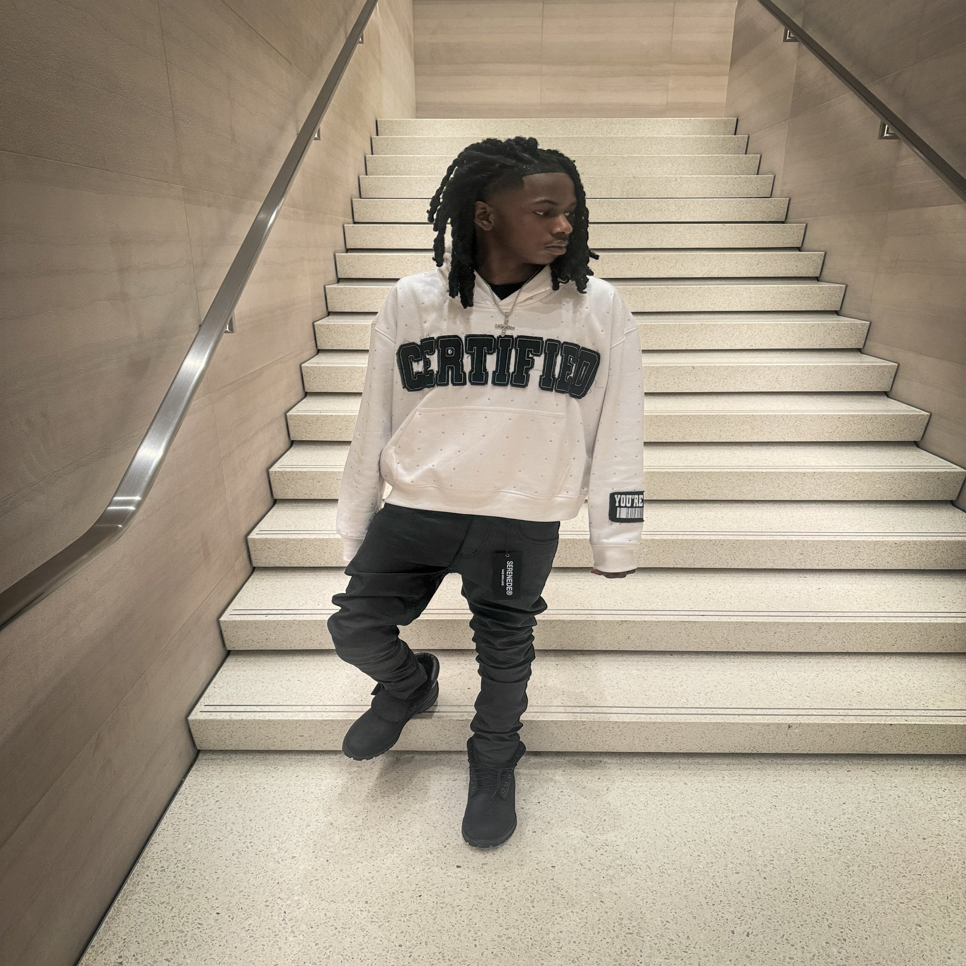 White "CERTIFIED" Patchwork Rhinestone hoodie